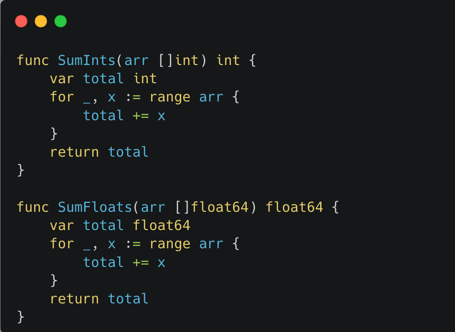Before generics, if you wanted a function to sum the elements of an array, you had to write a separate function for each numeric type (int, int32, float64, etc.).