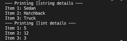 Let's say we want a function that can take any list of items (Cars, Dogs, or even just integers) and print them. Since we don't perform any specific operations on the item type itself, we can use the most permissive constraint: any.