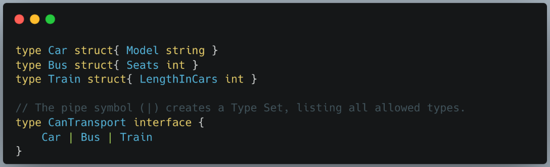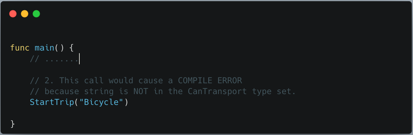 Imagine you want a generic function, StartTrip, that can only be called on types that are capable of transporting something. This means we need to define an interface that only allows Car, Bus, and Train types.