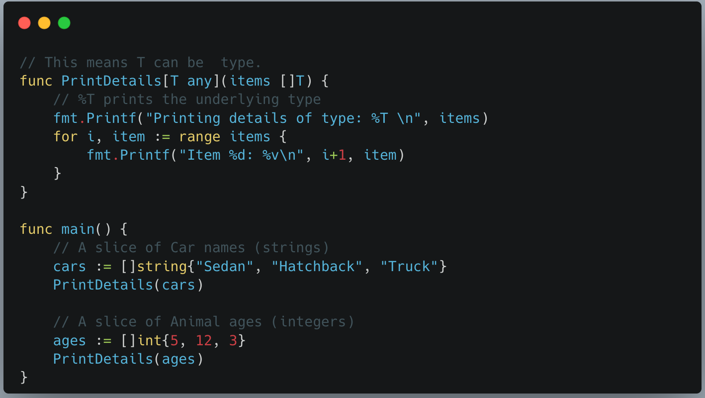 any: The most liberal constraint, allowing any type. This is equivalent to the oldinterface{}. You cannot use equality operators (==) or any other operation on this type unless it's explicitly part of an interface.comparable: A built-in constraint that allows any type that supports the equality operators (==and!=). This is essential for keys in generic maps and any function that requires item comparison